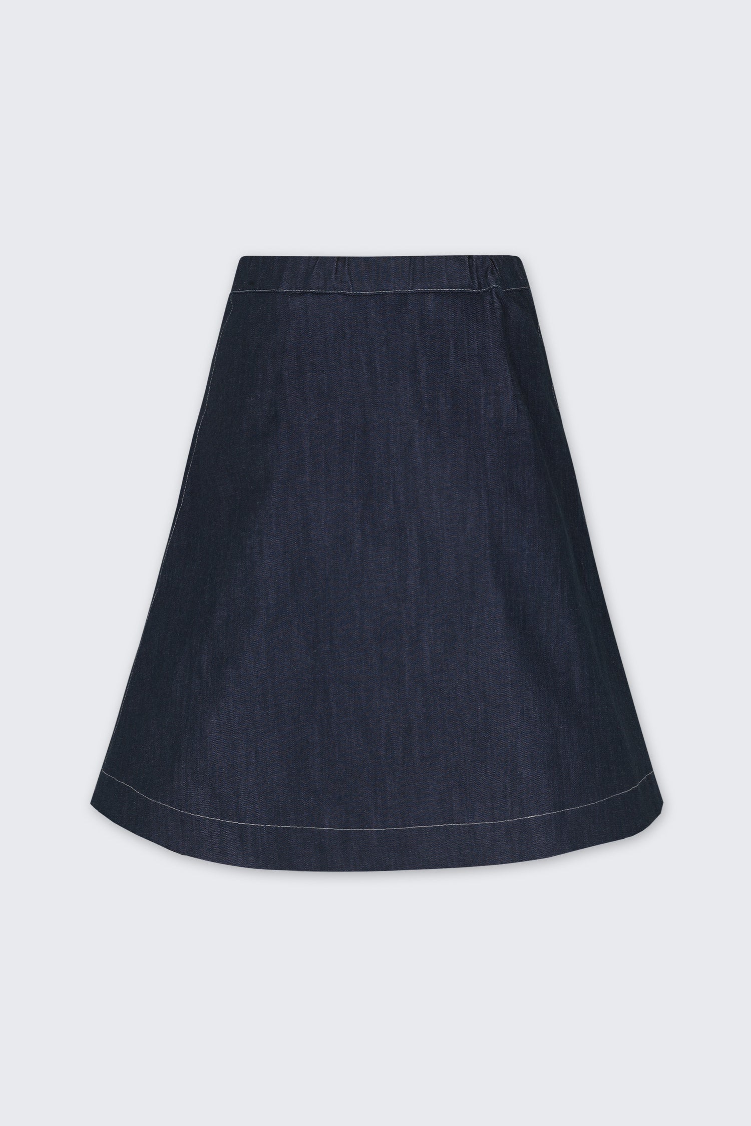 The denim skirt has side pockets and can be opened all the way down in the front. There is an elastic band in the back which makes it possible to variate in size. Bottoms are made from recycled paper.