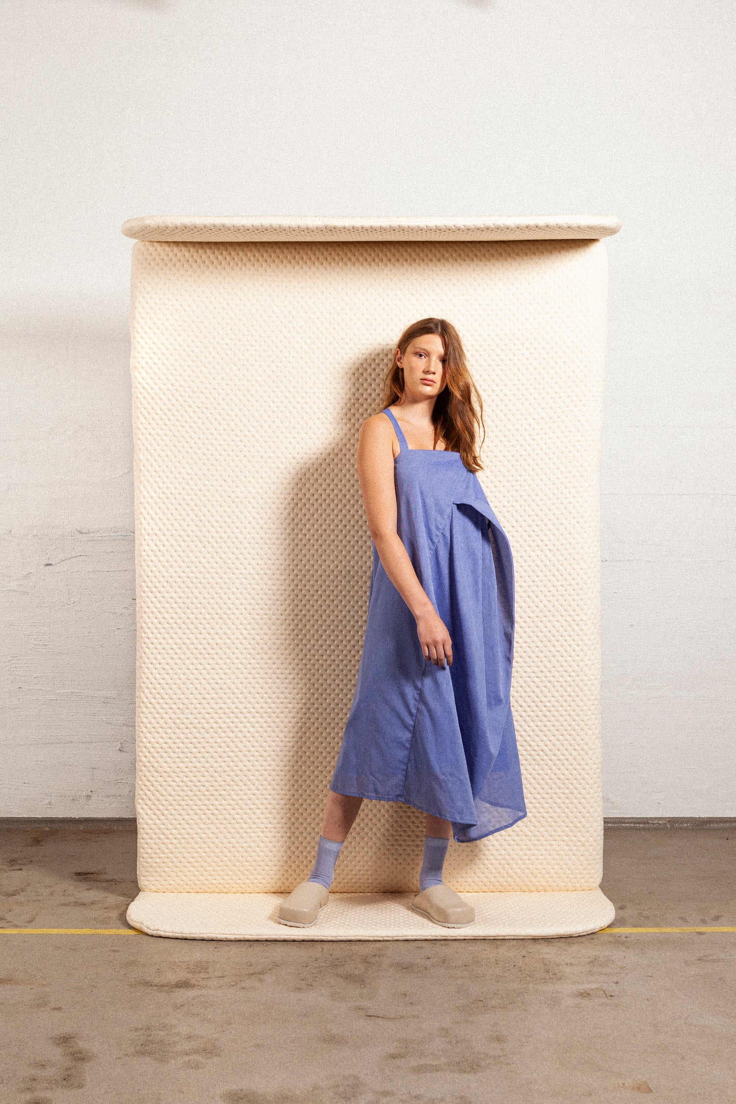 The Sleeping Line is made of woven cotton sourced in Portugal from dead stock to minimize waste. This dress is inspired by traditional bed linen and constructed through a unique folding technique created from the characteristics of the material. Model is 173cm and wearing a size small.